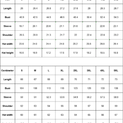 | Centimeter | S | M | L | XL | 2XL | 3XL | 4XL | 5XL |